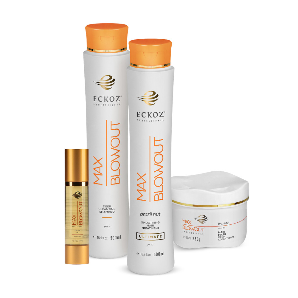 Specifically formulated to provide maximum smoothing results, our highly concentrated formula uses Brazil nut oil from the Amazon Rainforest. This tropical oil, rich in both vitamins A and E, acts as a natural hydrator for dry, lifeless hair, and it produces unparalleled shine. Combined with Argan Oil, and key revitalizing emollients, our innovative Max Blowout formula delivers the best in hair straightening and smoothing. By infusing keratin molecules deep within the hair cuticle, hair is restored and hydrated. The result is shiny, soft, smooth, and frizz-free hair from roots to ends. Results will last 12-16 weeks.